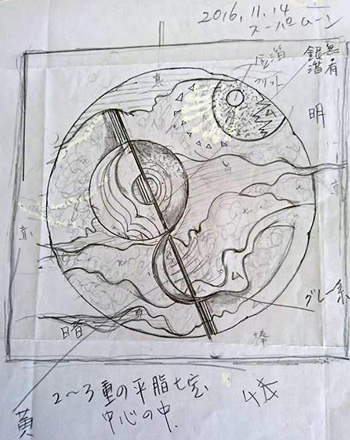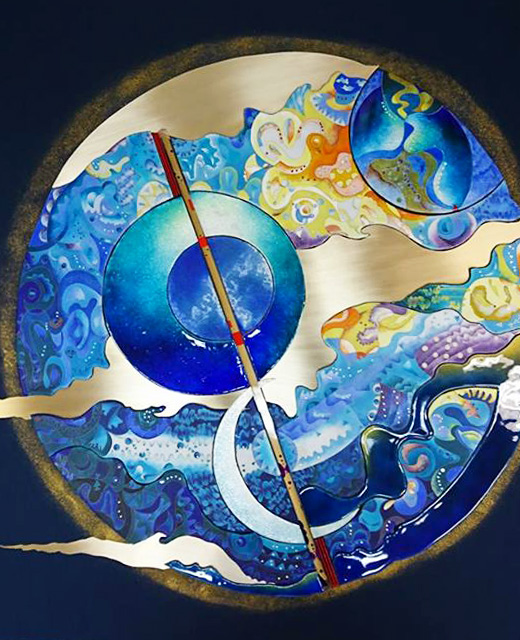 2016年の11月14日 朝のラジオにて ニュースキャスターが 今日は、月がもっとも近づくスーパームーンの日です、 68年ぶりの大接近と。 しかし、14日関東は雨でした。 想像の中の私なりのスーパームーンを描き、 七宝にて制作しました。